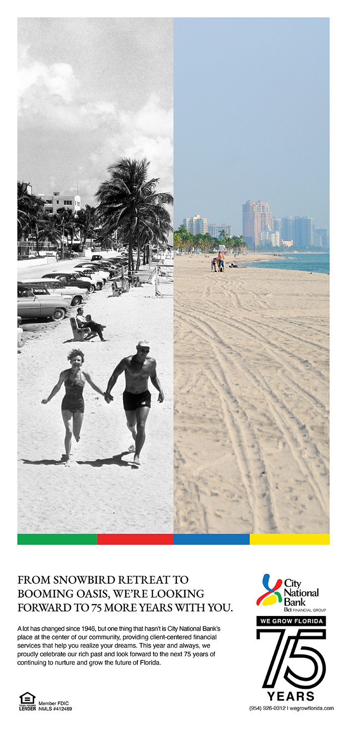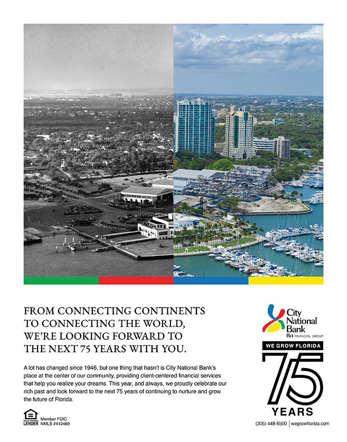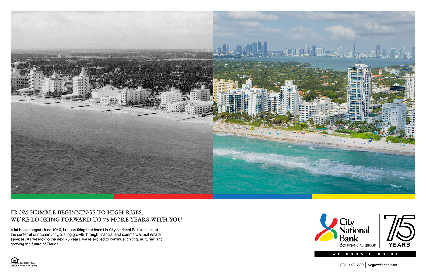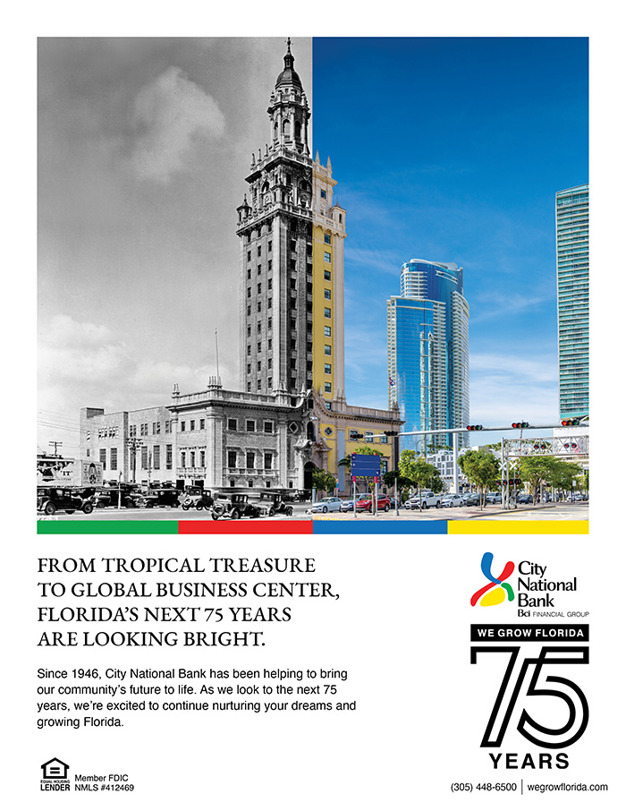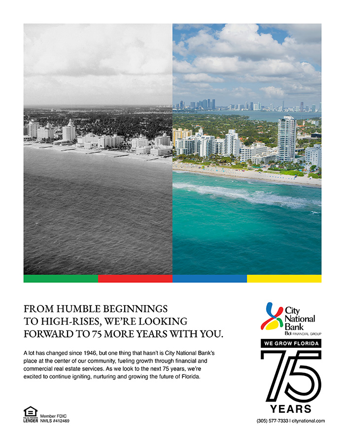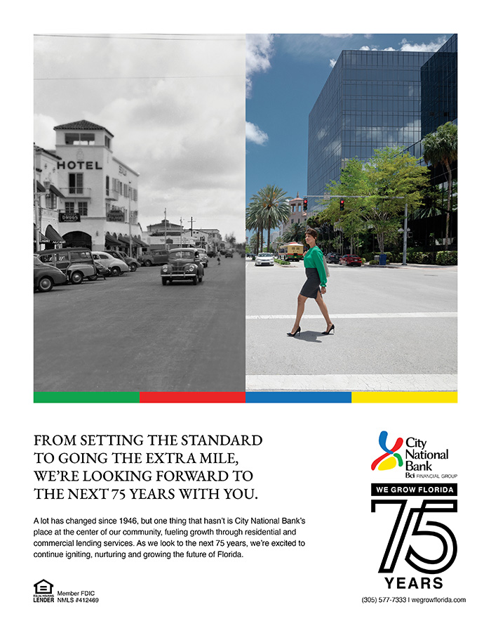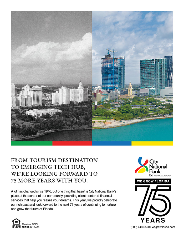 Founded in Miami Beach in 1946, City National has been a pillar of the local community for 75 years. There are countless examples of the footprint City National Bank has left, and is leaving, in Florida. But today, 75 years later, we find ourselves poised and in a great position for the future. We’ve secured a role as the “hometown” bank and, as we think about how to pave the way to a stronger future, we are ready to be the bank that fuels the next generation of Florida.